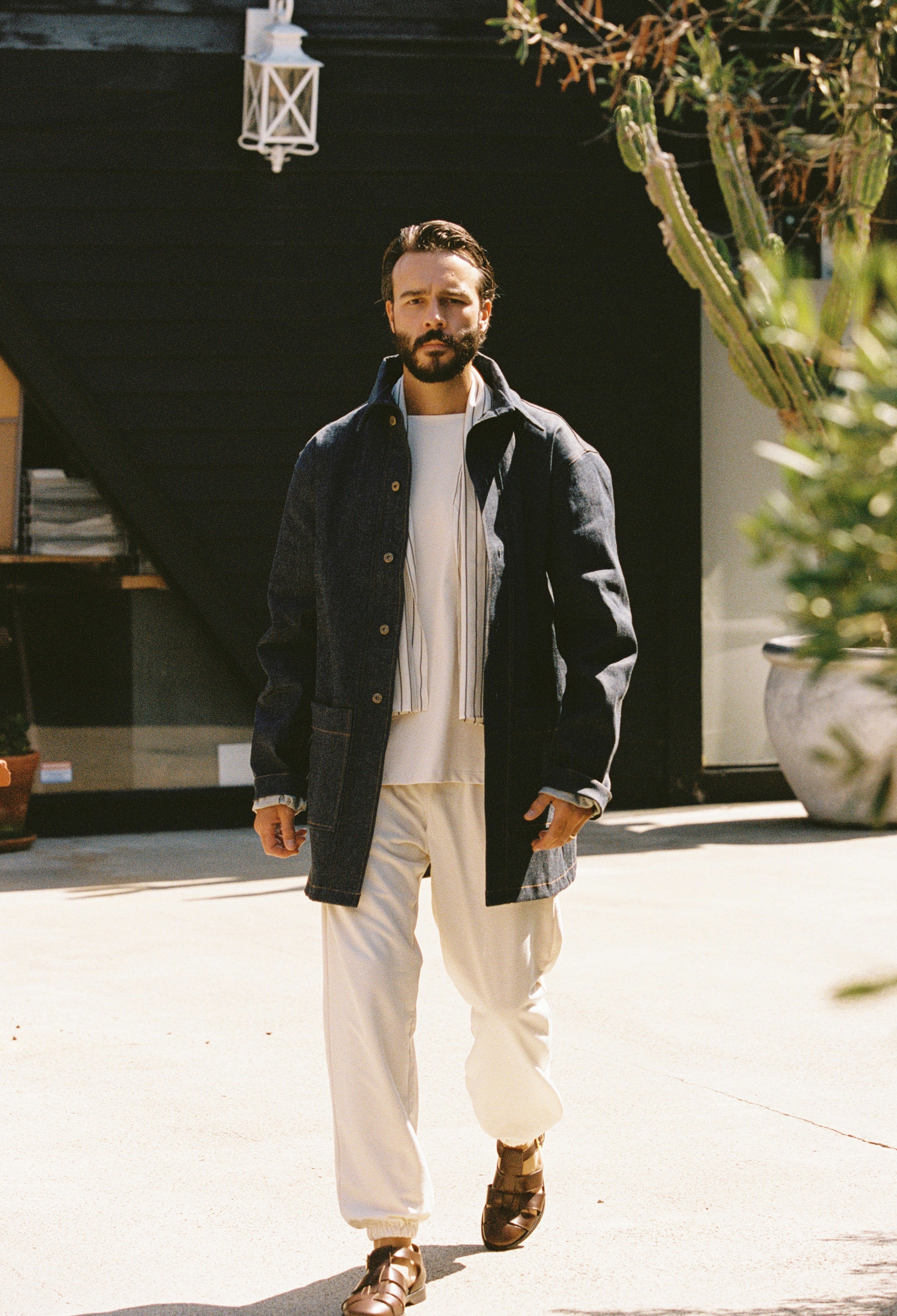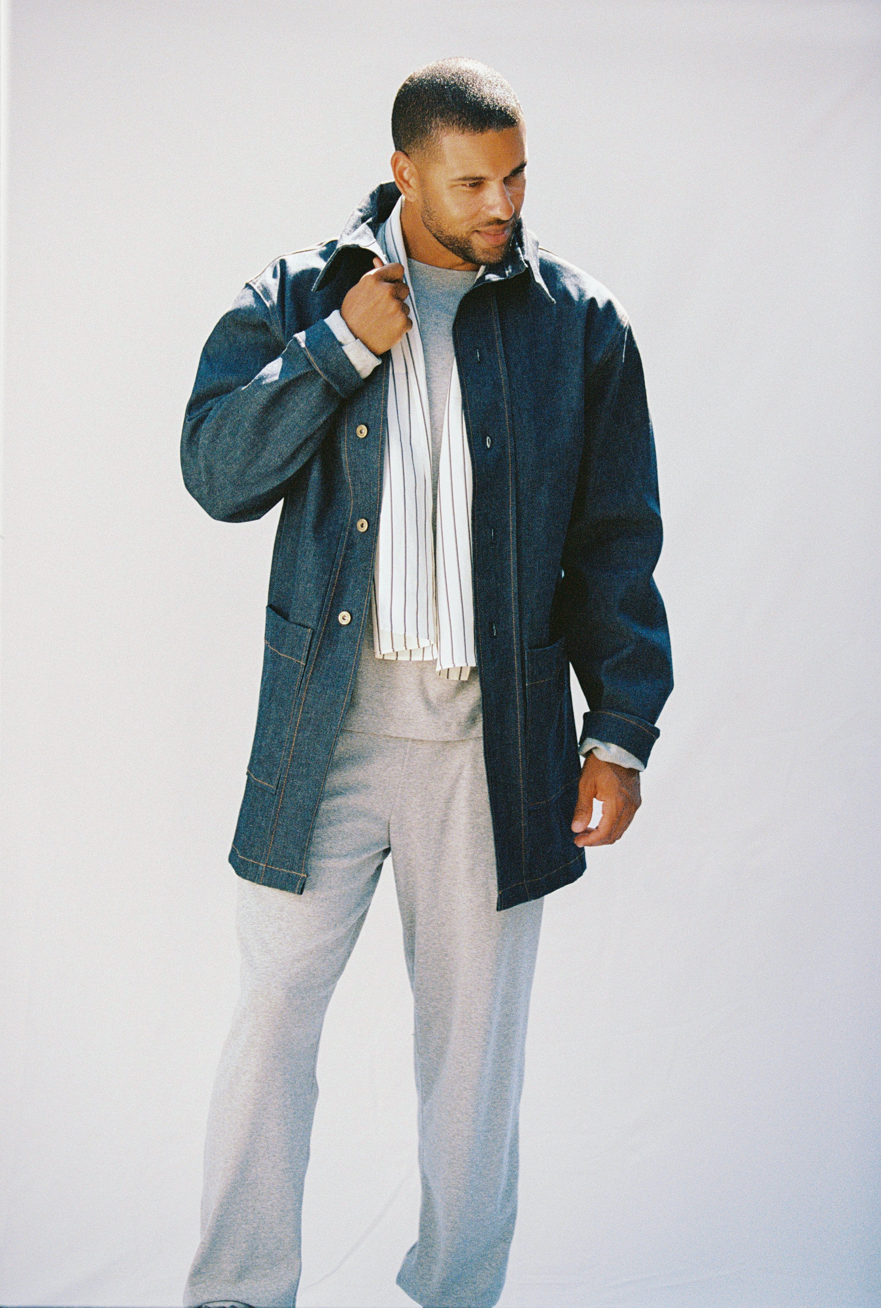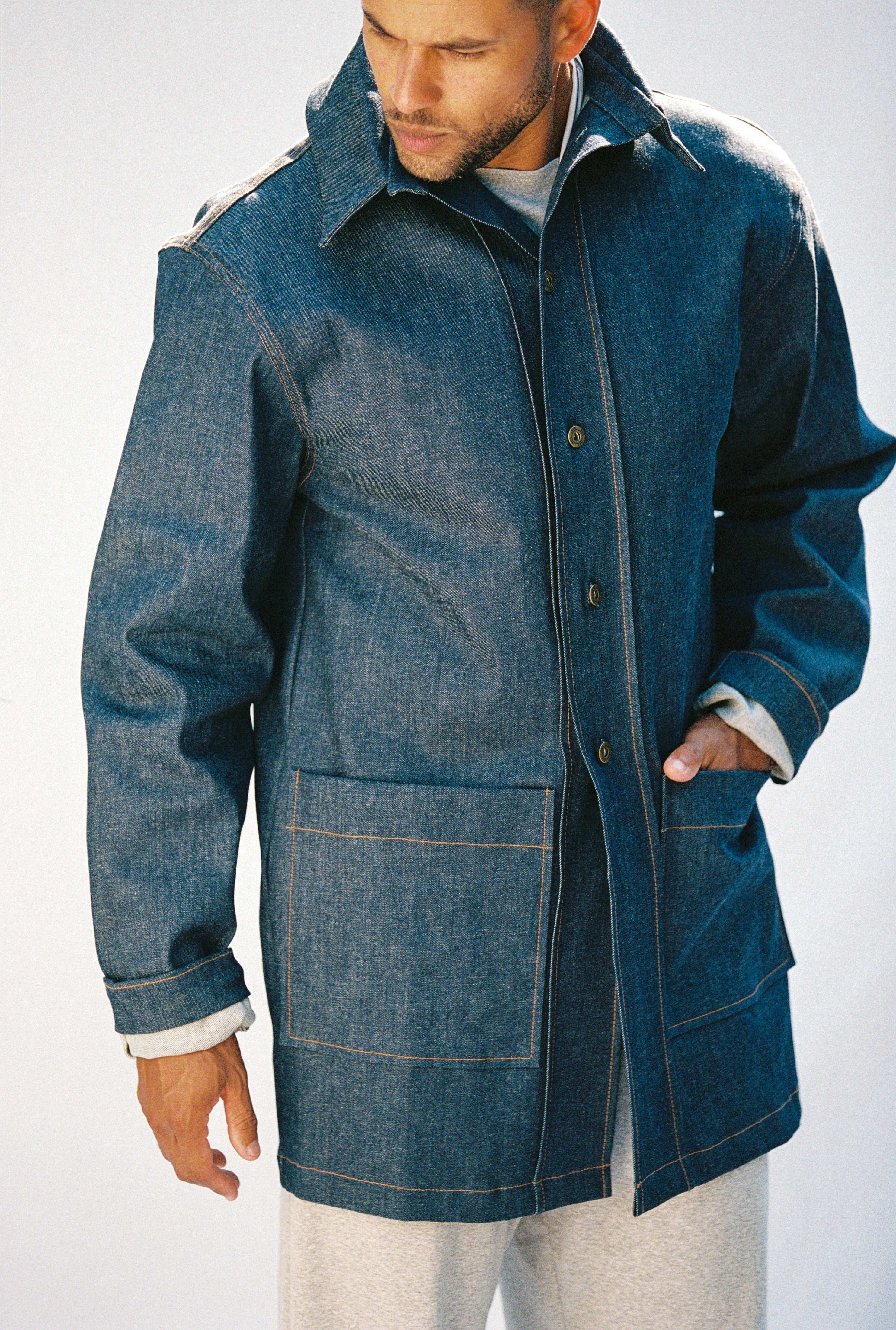 Introducing the Nico Denim Jacket — made from 100% organic Italian denim. Inspired by the French chore coat. You can throw it over sweats or wear it with our Una paperbag pants. It's true to it's roots — it will always work for you.